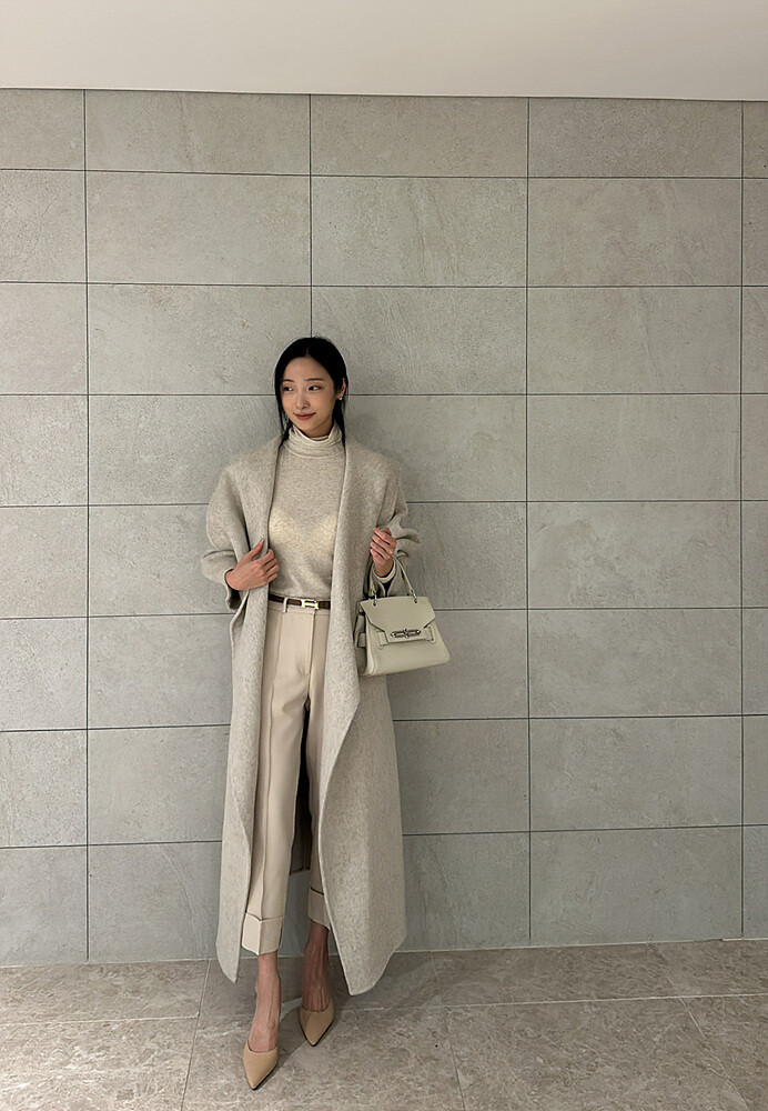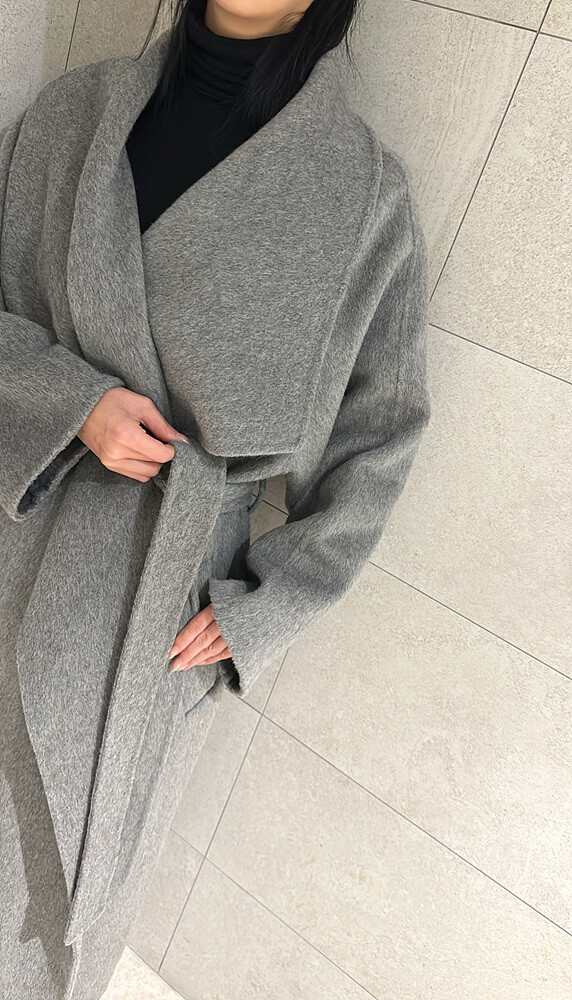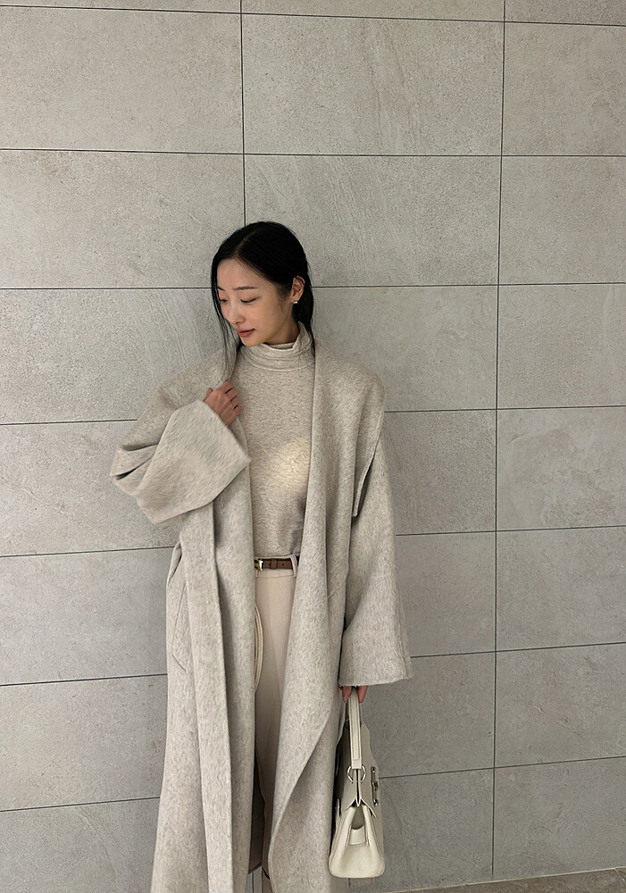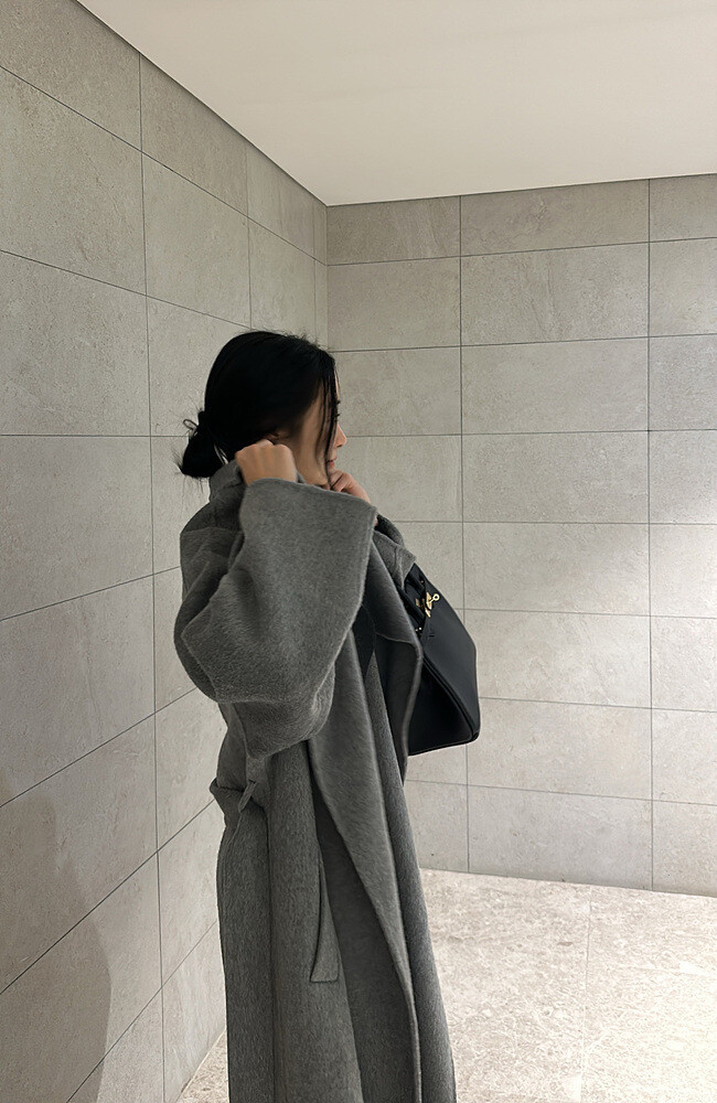 로브 스타일의 코트로 벨트를 허리에 묶어