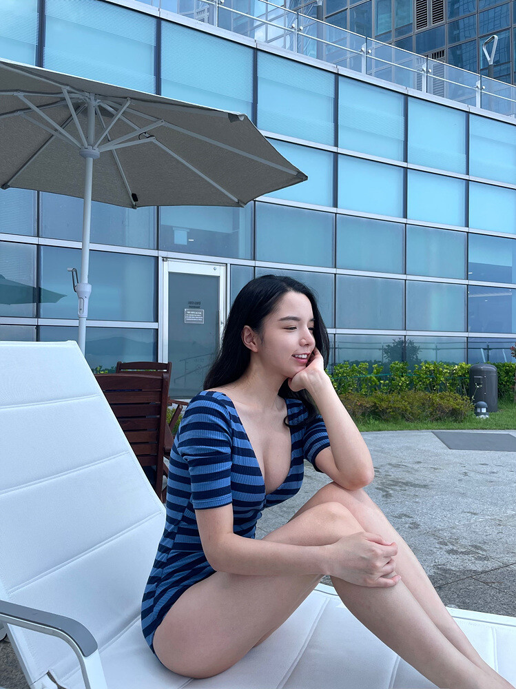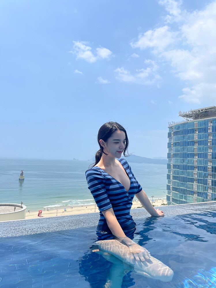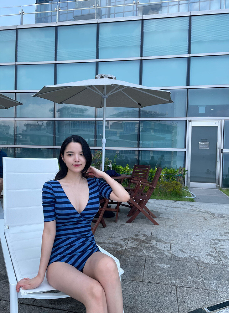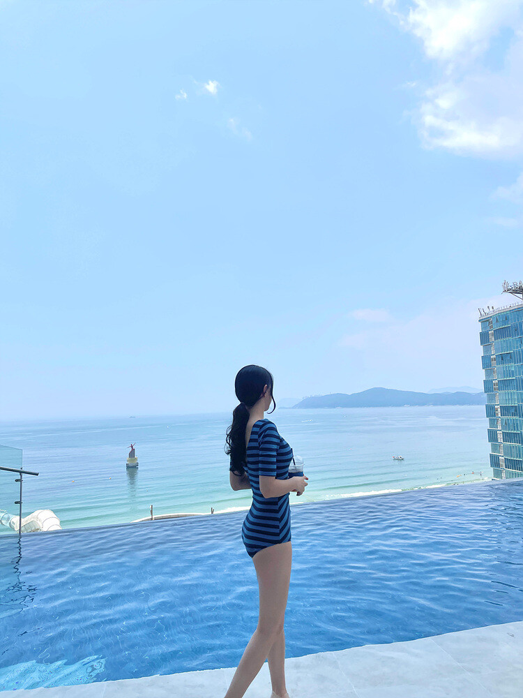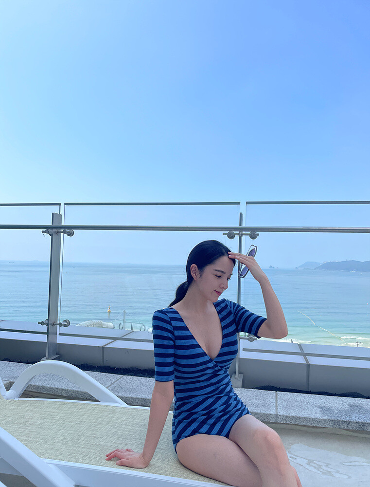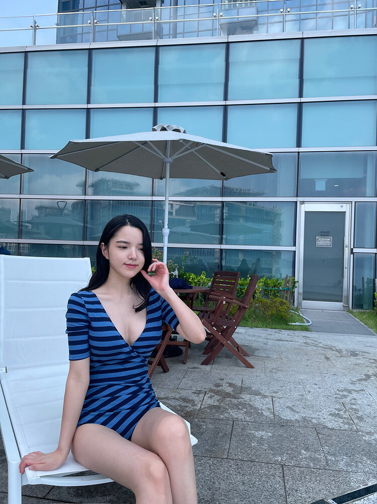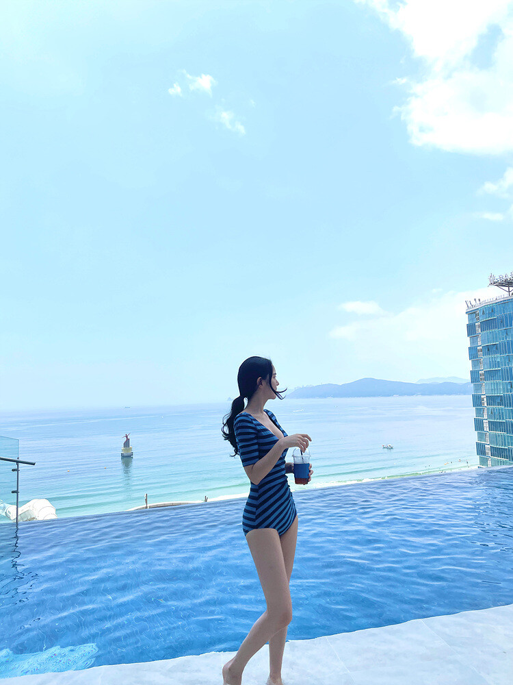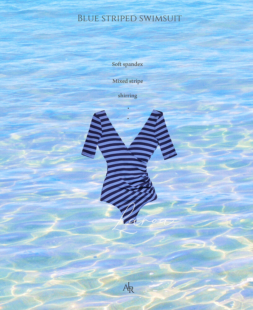 블루톤 조합의 스트라이프 패턴의 모노키니 입니다.