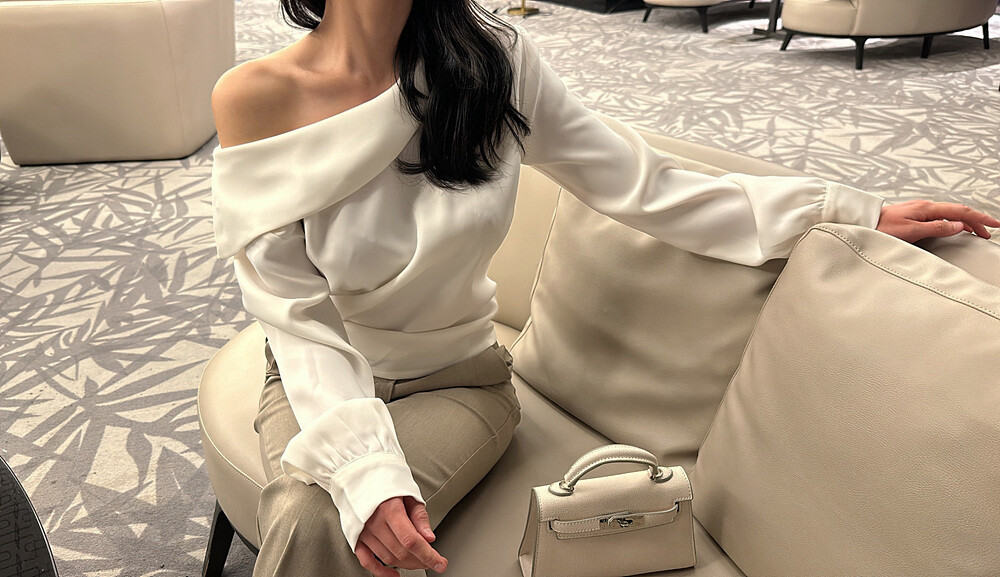 쇄골 아래로 접히는 비대칭적인 오프 숄더 디자인으로