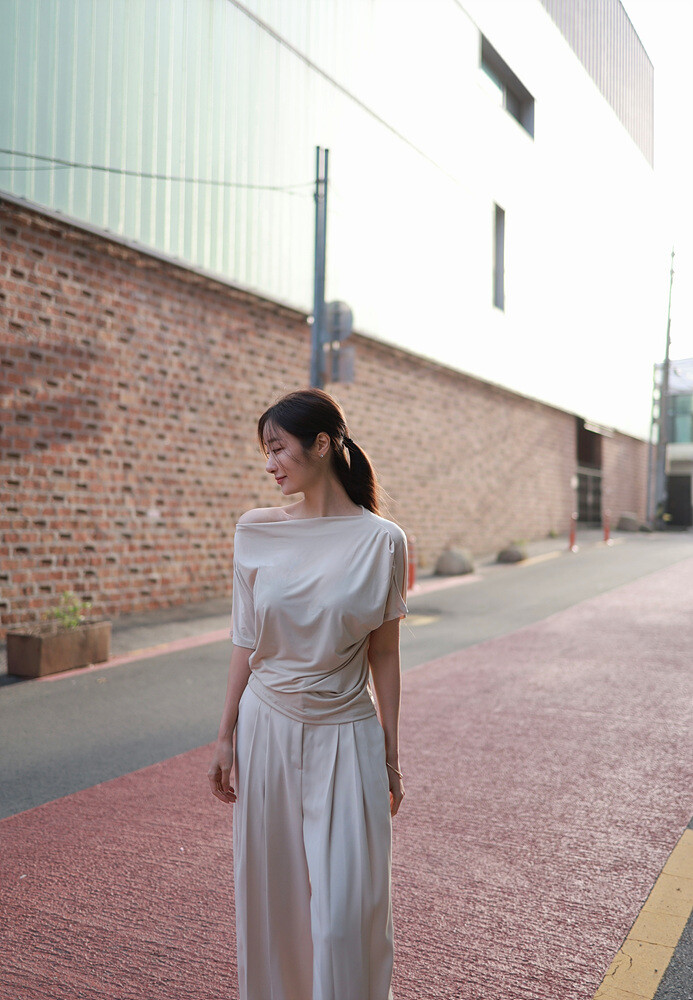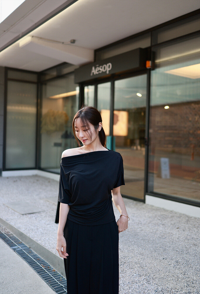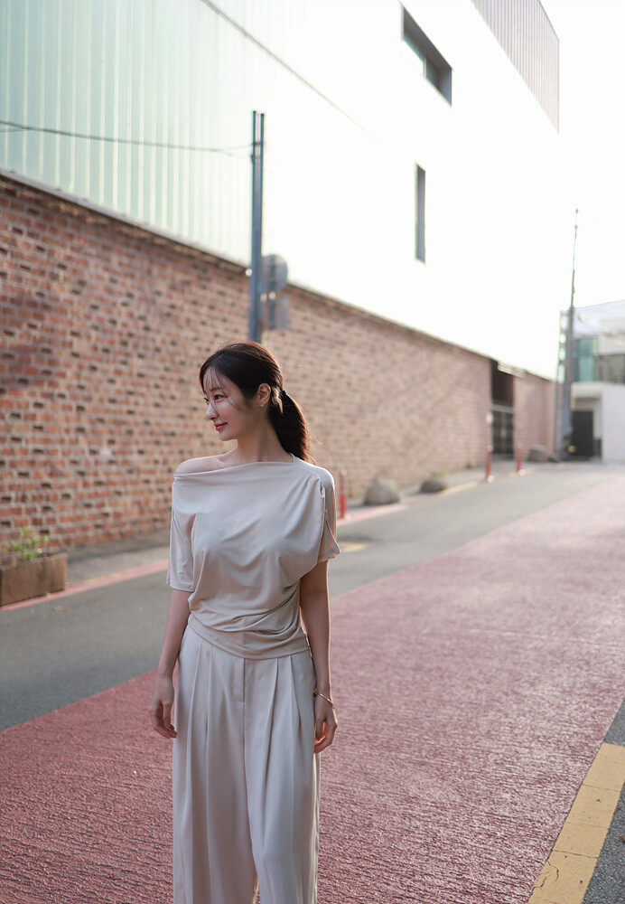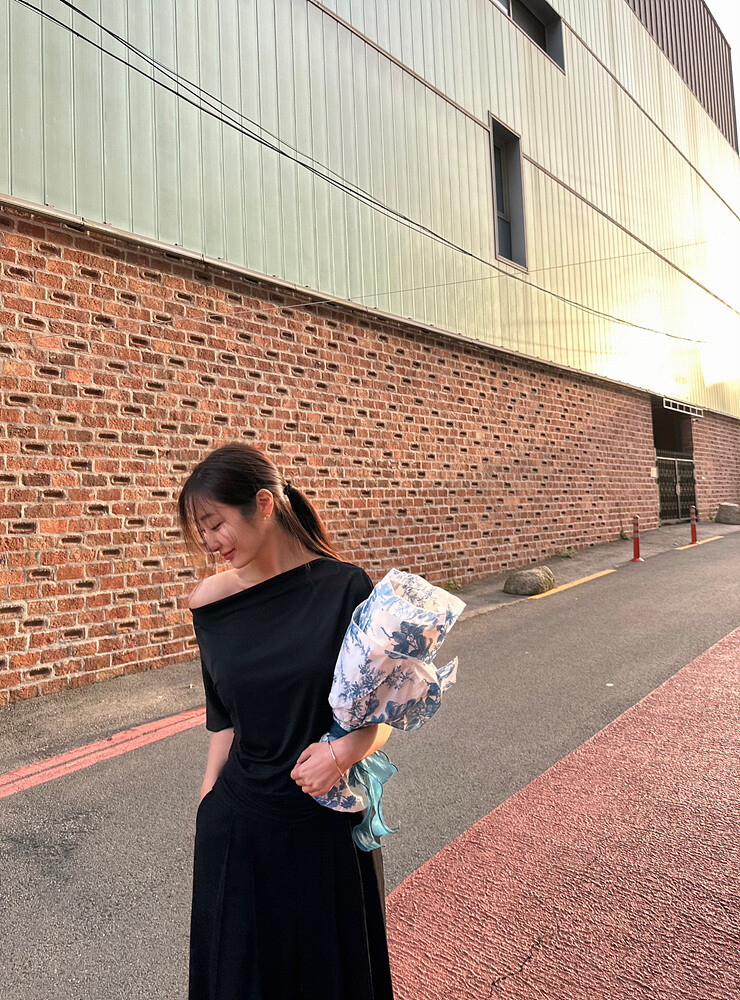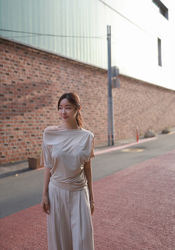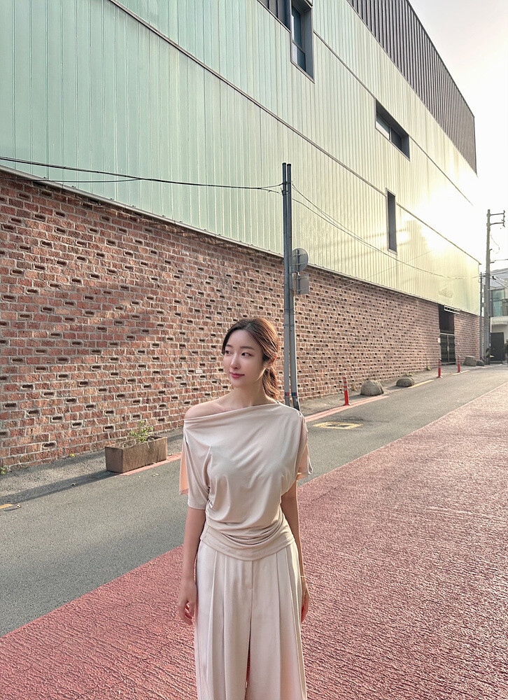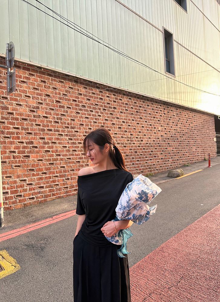 쇄골라인이 살짝 보이는 원오프숄더 디자인으로