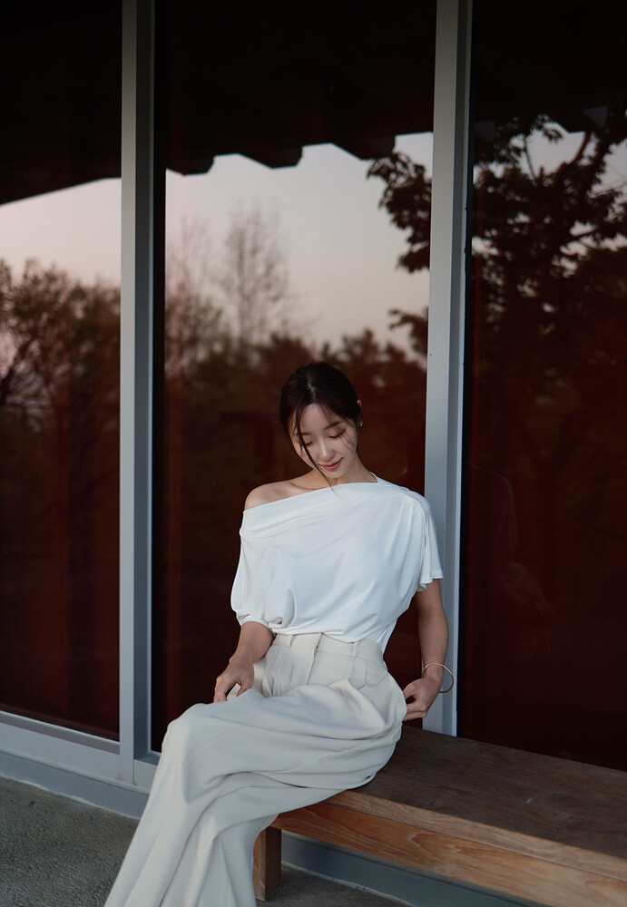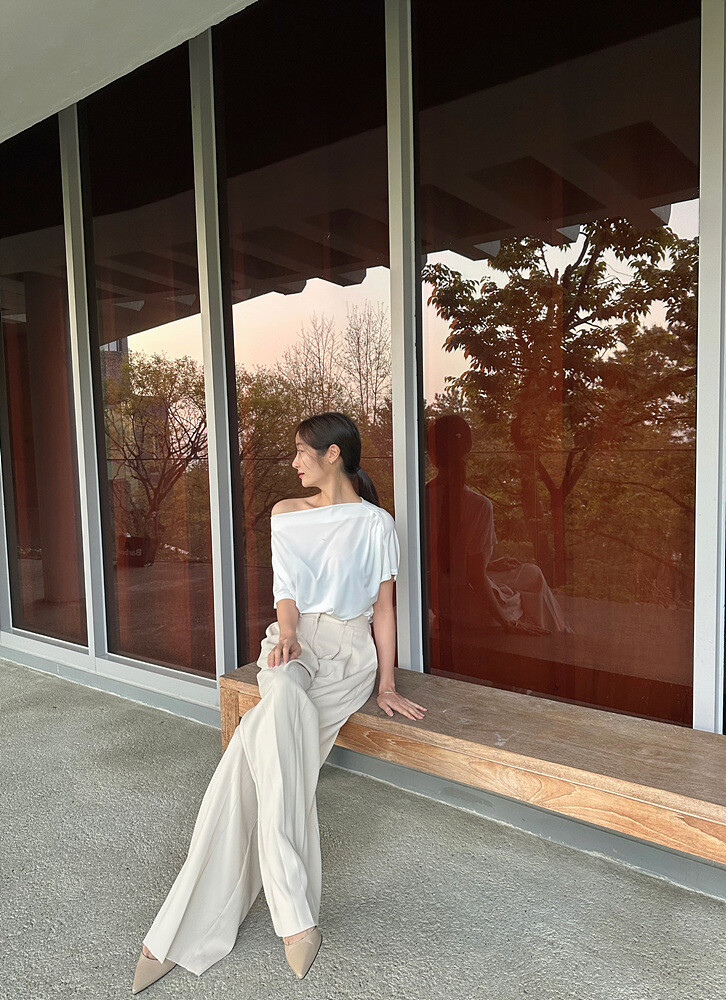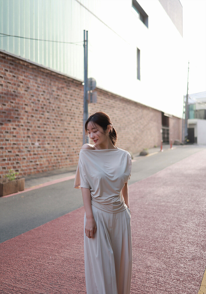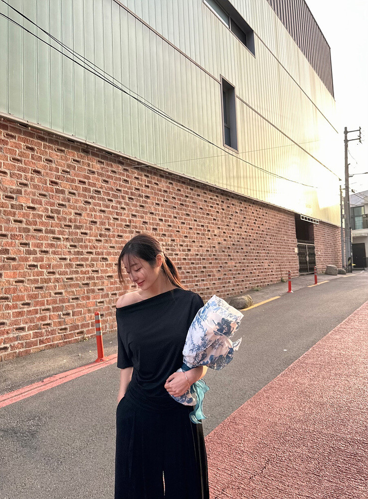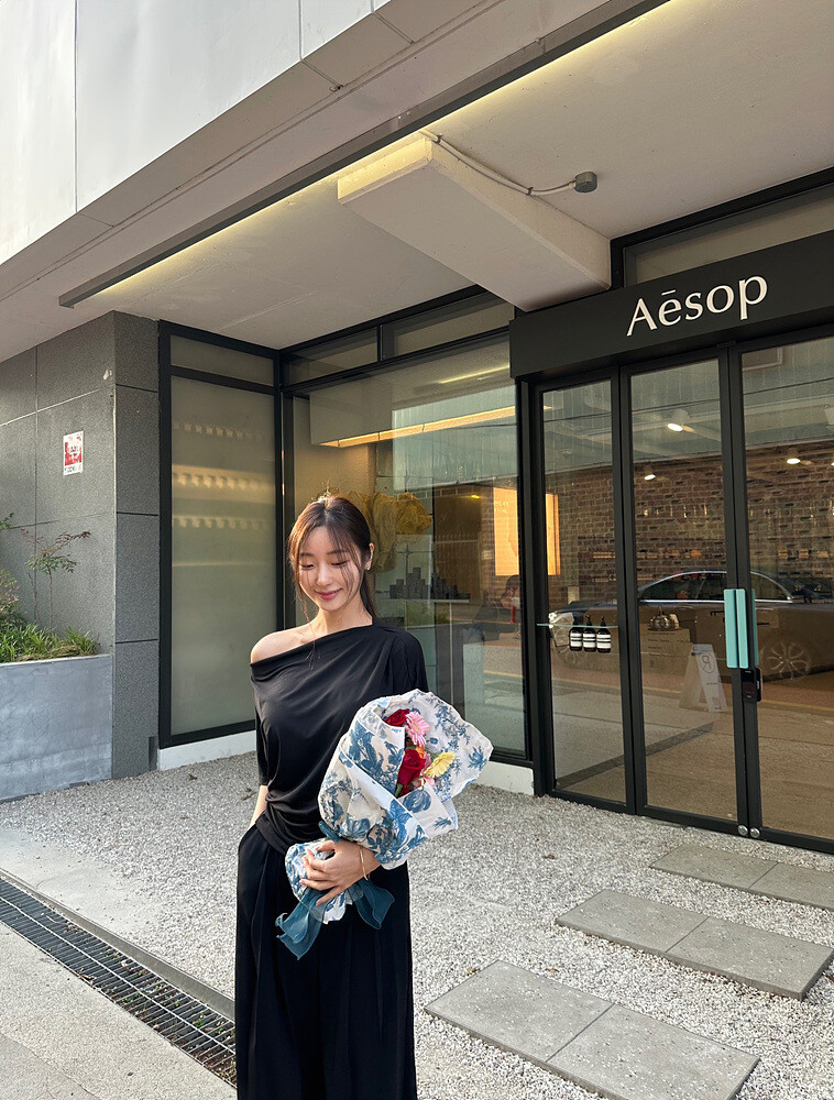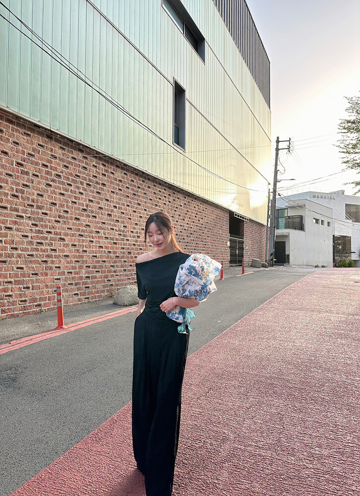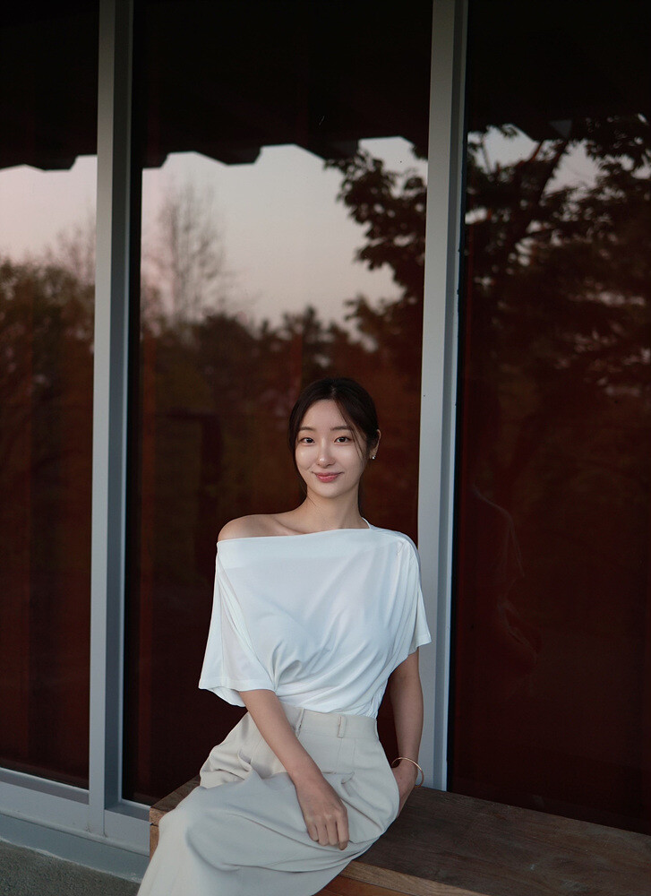쇄골라인이 살짝 보이는 원오프숄더 디자인으로