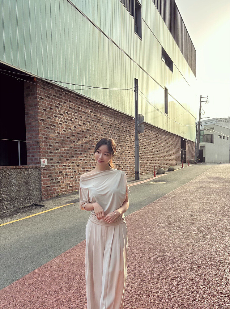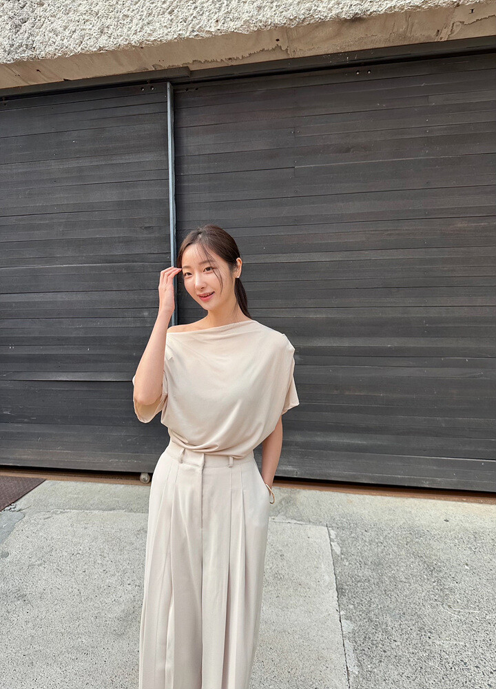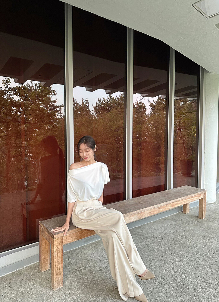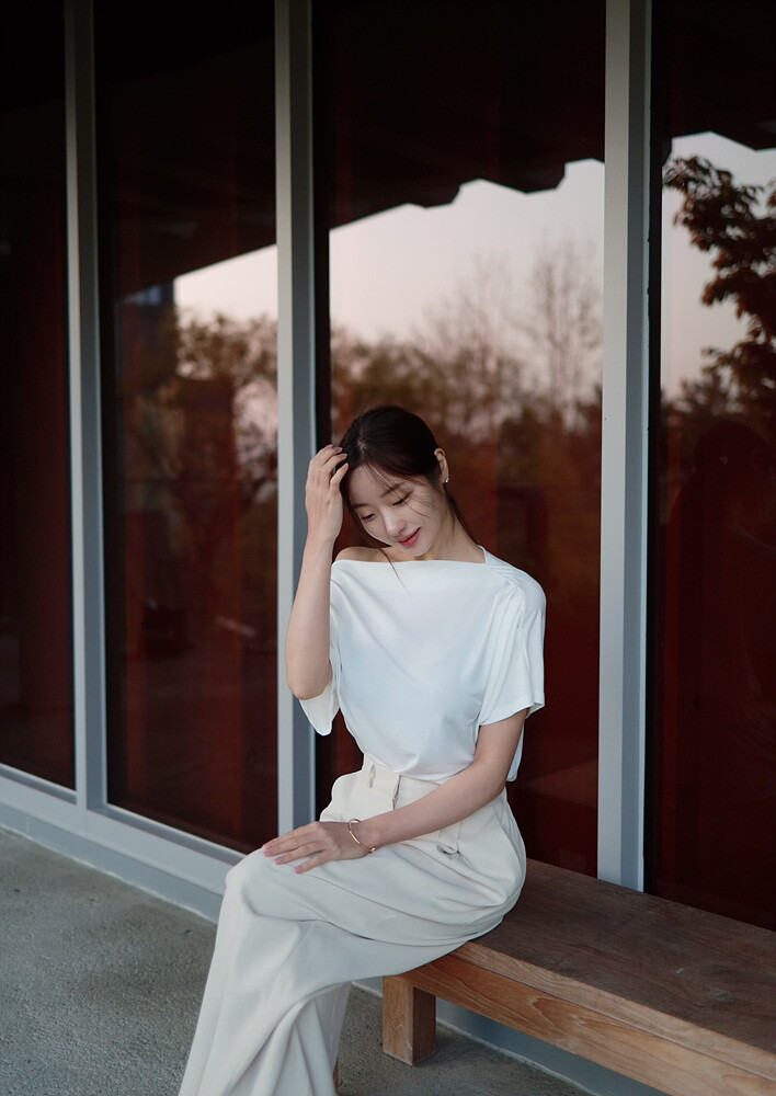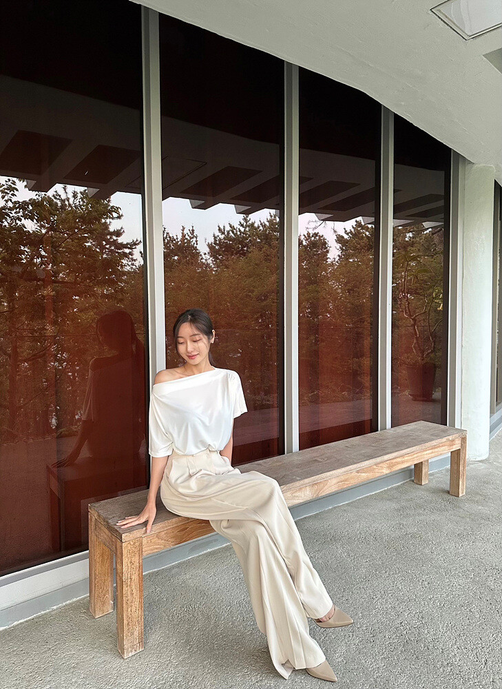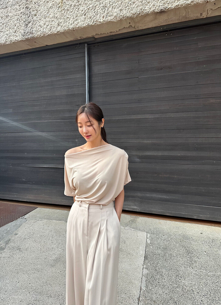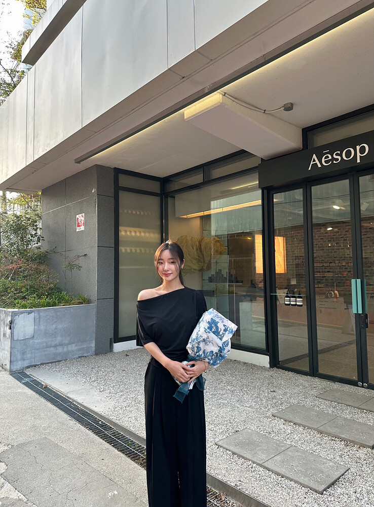 쇄골라인이 살짝 보이는 원오프숄더 디자인으로