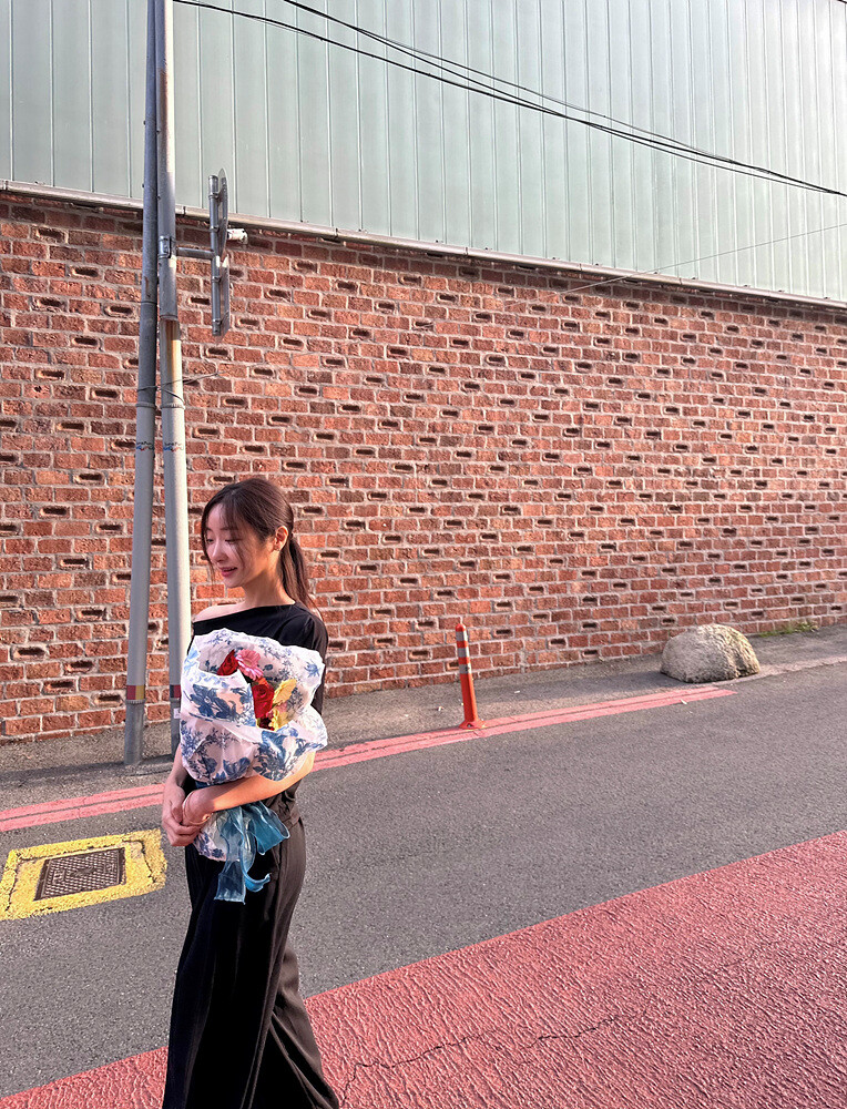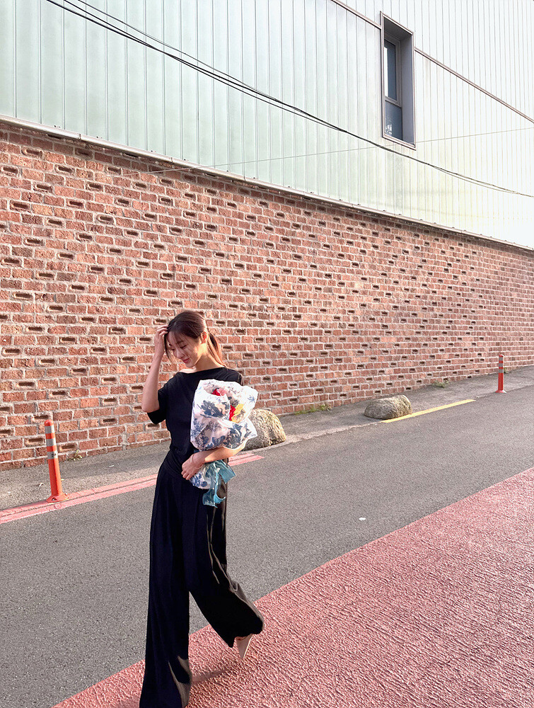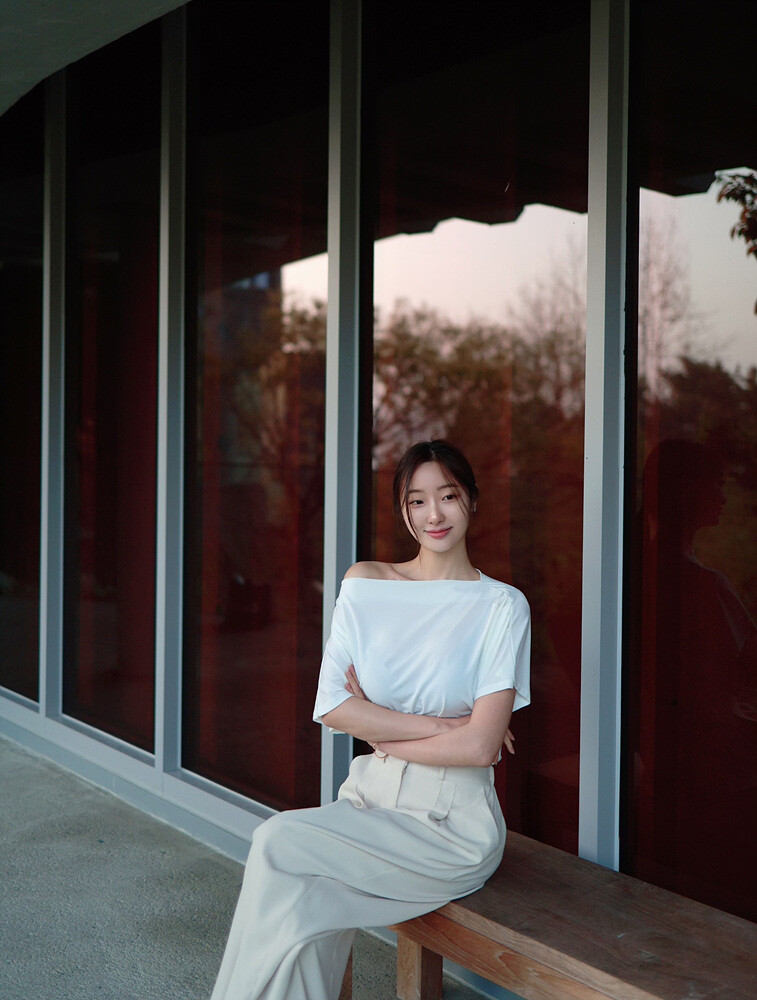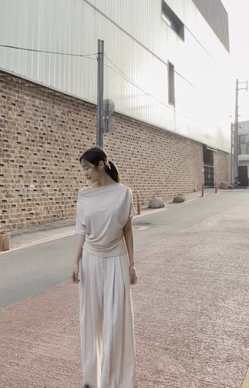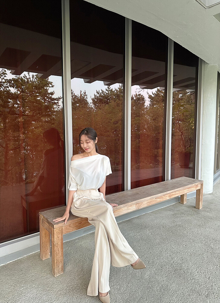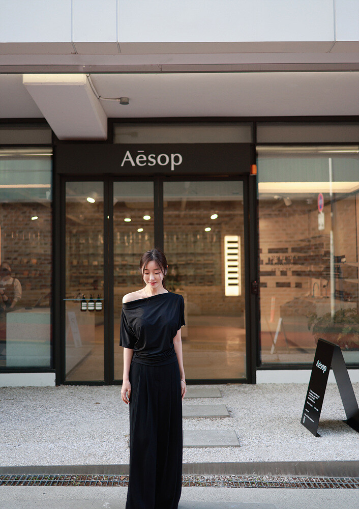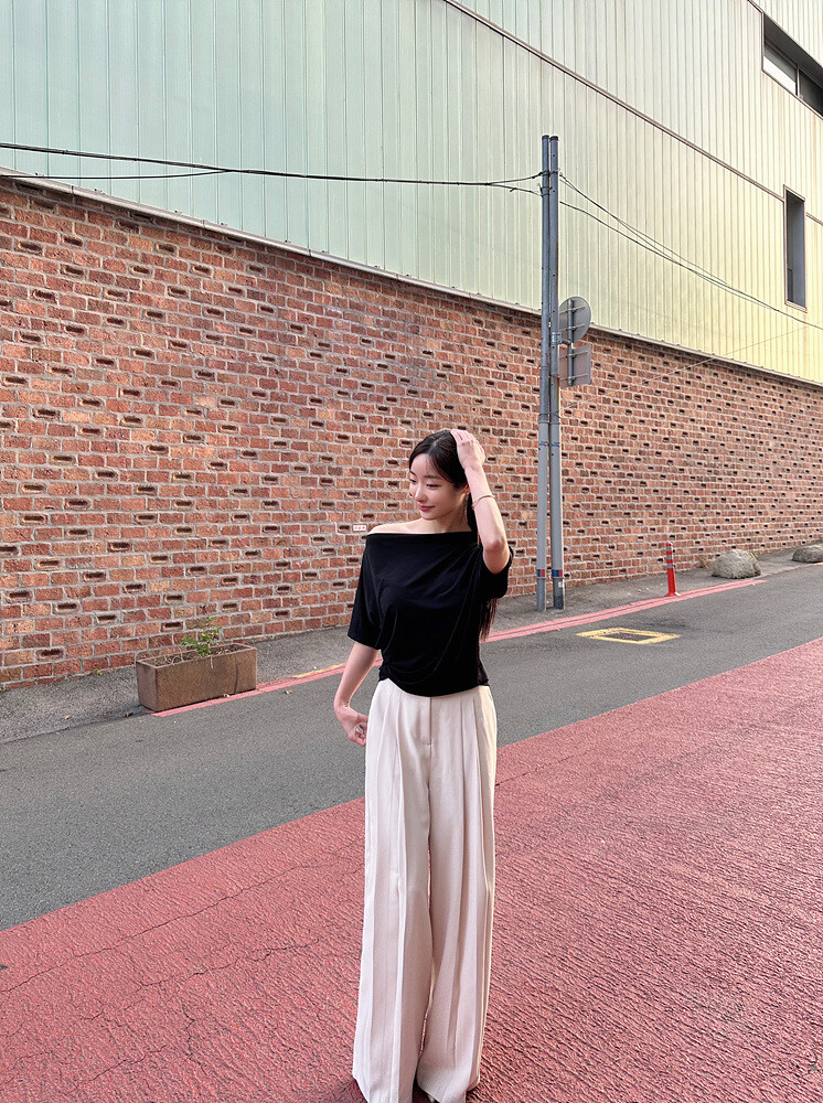 쇄골라인이 살짝 보이는 원오프숄더 디자인으로
